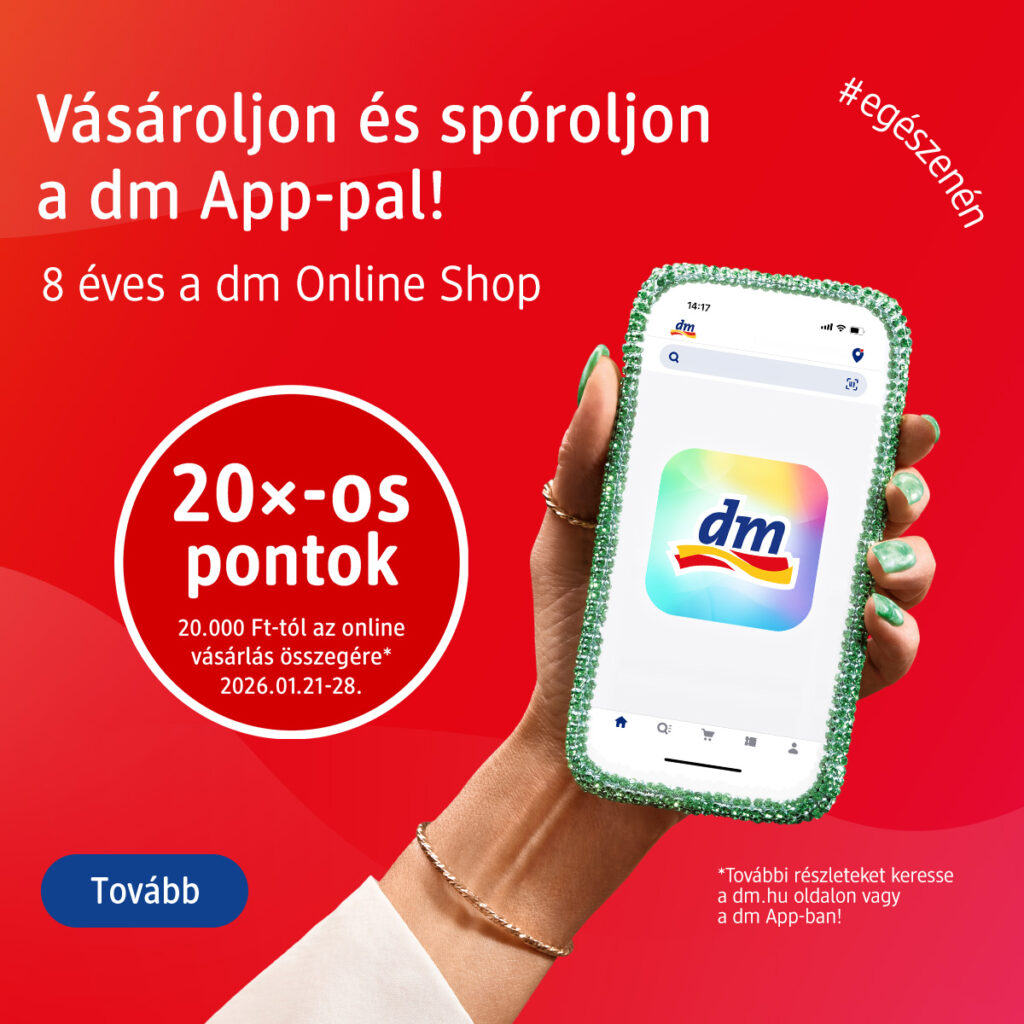 2026.01.21-28. között 20x-os pontok 20.000 Ft-tól az online vásárlás összegére. Ünnepelj velünk és spórolj a dm App-pal!